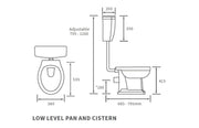 - Includes Low Level Cistern, Flush Pipe Kit, Pan & Seat only